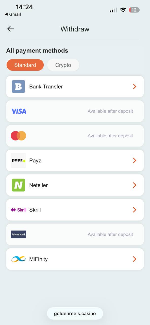 Deposit options: Visa, Mastercard, Paysafecard, Skrill, Neteller, Google Pay, Apple Pay, MiFinity, Neosurf, POLi, Jetonbank, Skinsback, USDT Tether (ERC20, TRC20, BEP20), BTC Bitcoin, ETH Ethereum, DOGE Dogecoin, BCH Bitcoin Cash, BNB Binance Coin, LTC Litecoin, TRX Tron, XRP Ripple…