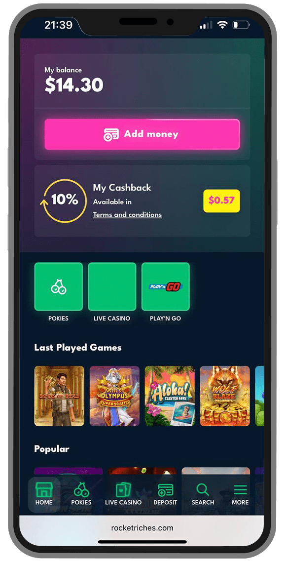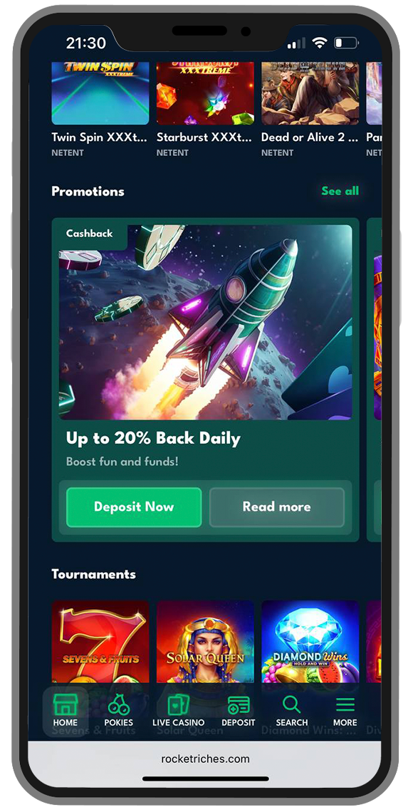 Rocket Riches pushes the aggression further: up to 20 % cashback calculated on a strict midnight-to-midnight window, claimable for roughly 24 hours the next day. I torched NZ $200 in Dead or Alive II on Sunday, clicked the banner Monday morning, and snagged NZ $40 back, but the refund carries wagering around 10 ×. Live-dealer games and sports bets don’t count, but I’m here for pokies anyway, so no harm done.