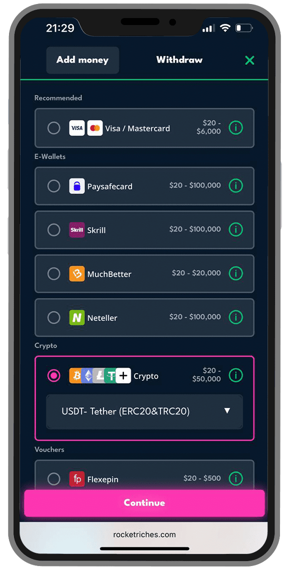 Payout options: Visa, Mastercard, Skrill, Crypto (USDT ERC‑20, USDT TRC‑20, USDT SOL...
