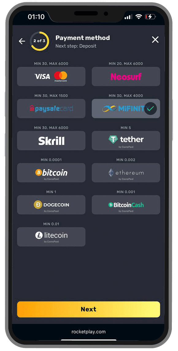 Deposit options:Visa, MasterCard, Instant Bank Transfer, Revolut, MiFinity, eZeeWallet, Jeton, CASHlib, Binance, Bitcoin, Litecoin, Dogecoin, Ethereum, Tether, Ripple, TRON, Monero, Apple Pay, AstroPay Card, Pix, EPS, Google Pay, Sofort, UPI…