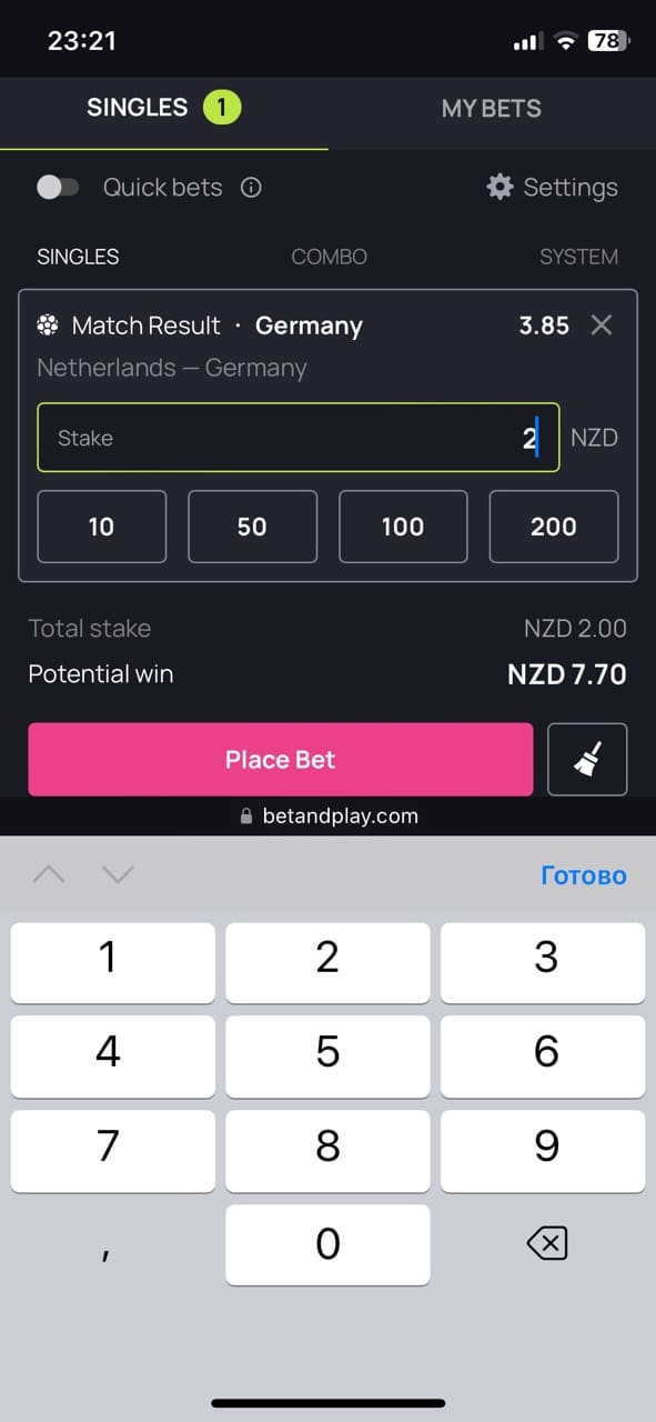 Well, of course, I placed bets on sports since I wanted to test the Bet and Play sportsbook. I placed a bet on Germany to win with a coefficient of 3.85 for Germany in the match Netherlands-Germany and on the rugby team Penrith Panthers to win with a coefficient of 1.44 in the match against Sydney Roosters.