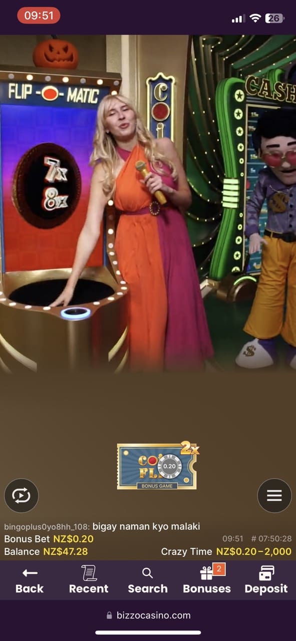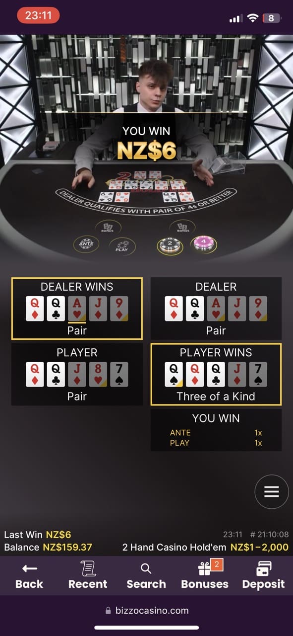 Among popular live dealer games in New Zealand, Bizzo offers Top Lobby, Live Casino Lobby, Gravity Roulette, Top Card, Lightning Storm, Crazy Time, Boom City, Funky Time, Aurora Blackjack Libra, One Blackjack, Dragon Tiger, and Caribbean Stud Poker, to name a few.