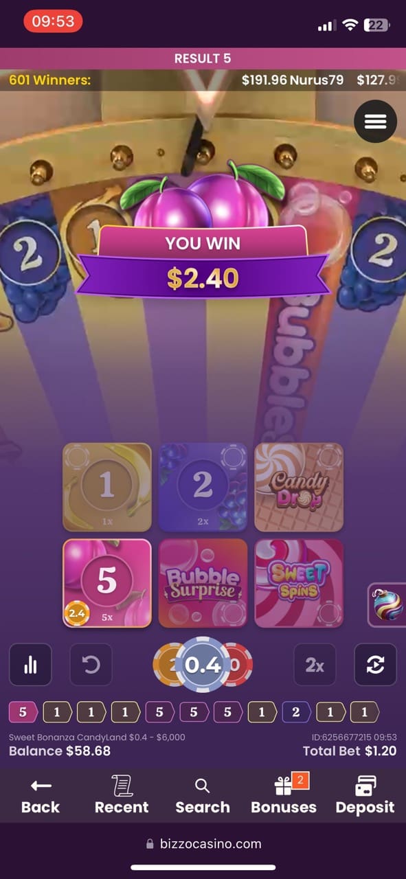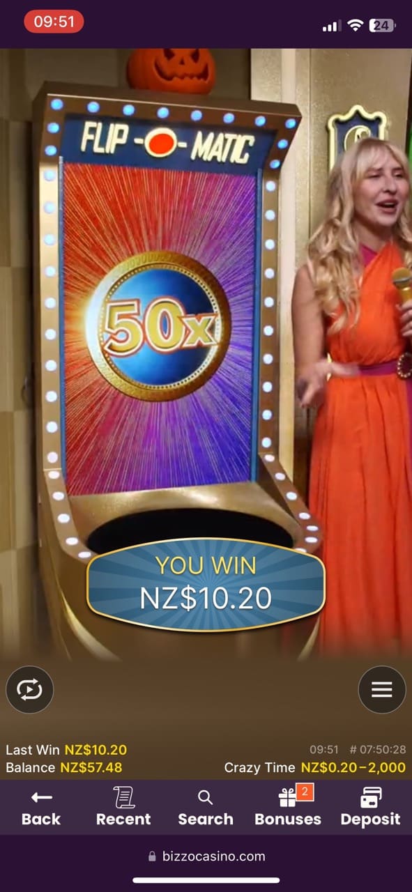 Then, I played some live casino games like two variations of Hand Casino Hold’em, where I managed to win 12 NZD and 6 NZD and tried a few live game shows like Crazy Time with 10 NZD reward and Sweet Bonanza Candy Land with small winnings.