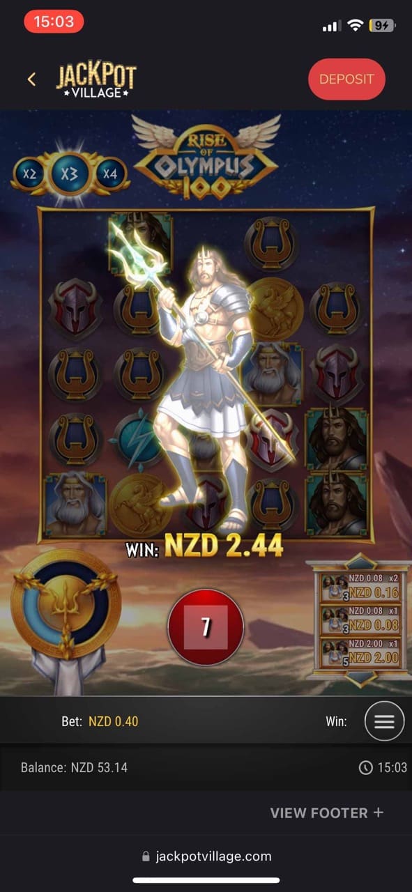 I activated the first deposit bonus, which is beaut. Jackpot Village gives a 200% bonus up to 500 NZD + 500 loyalty points + 50 free spins on the Rich Wilde and the Book of Dead pokies upon the first deposit. So, making a deposit of 20 NZD, I got +40 NZD in my account.