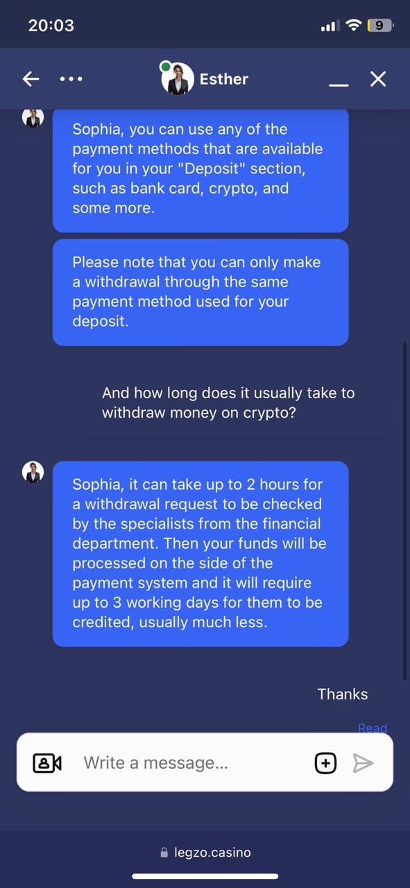 I didn’t really have questions, but I couldn’t forget to check the quality and competence of Legzo customer support. The staff is nice and friendly and replies within a few minutes.
