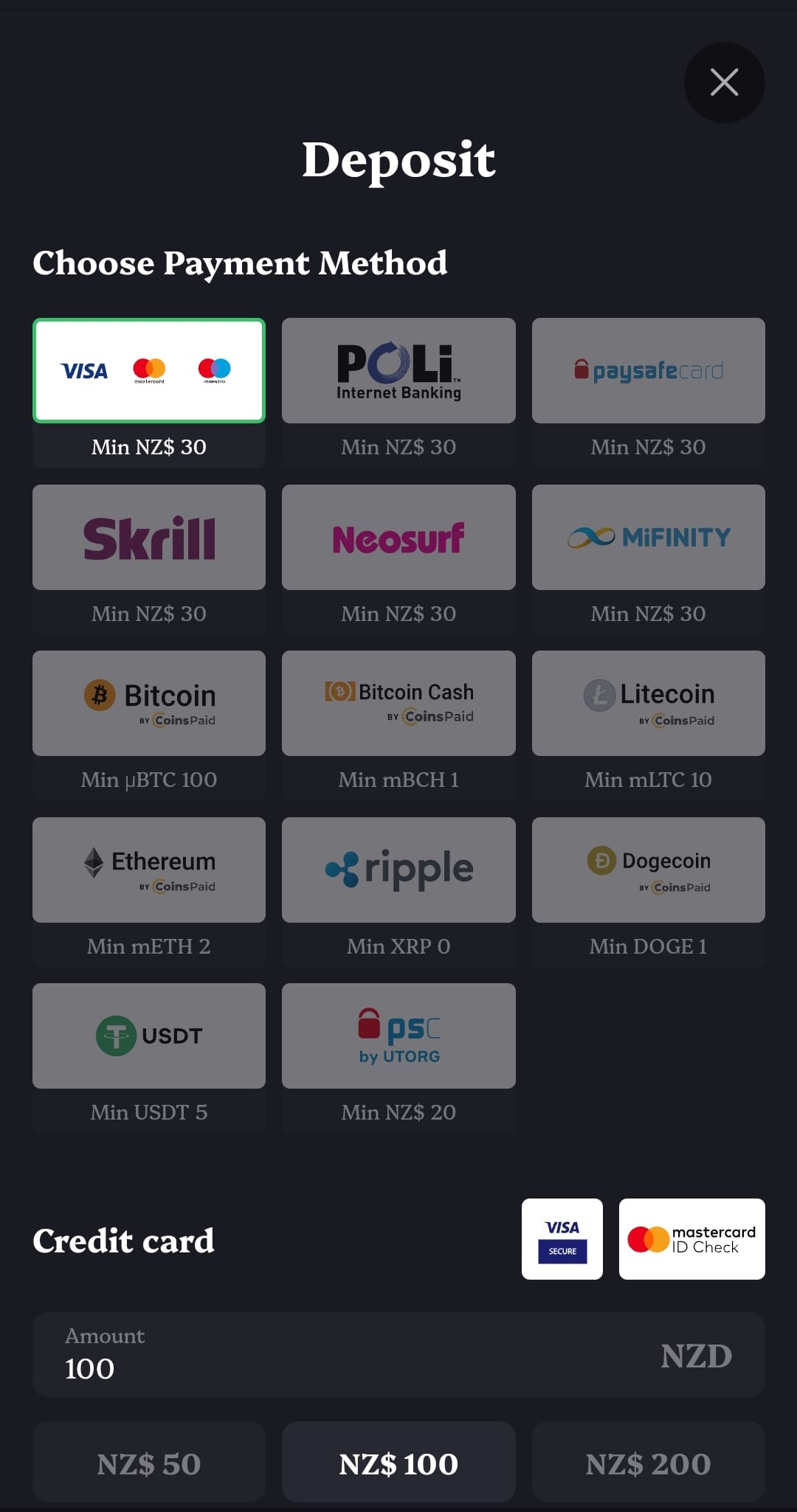 | Bonus | 200% up to NZ$1000 | 150% up to NZ$600 + 50 FS | 100% up to NZ$1000 + 200 FS | 100% up to NZ$1500 + 500 FS |