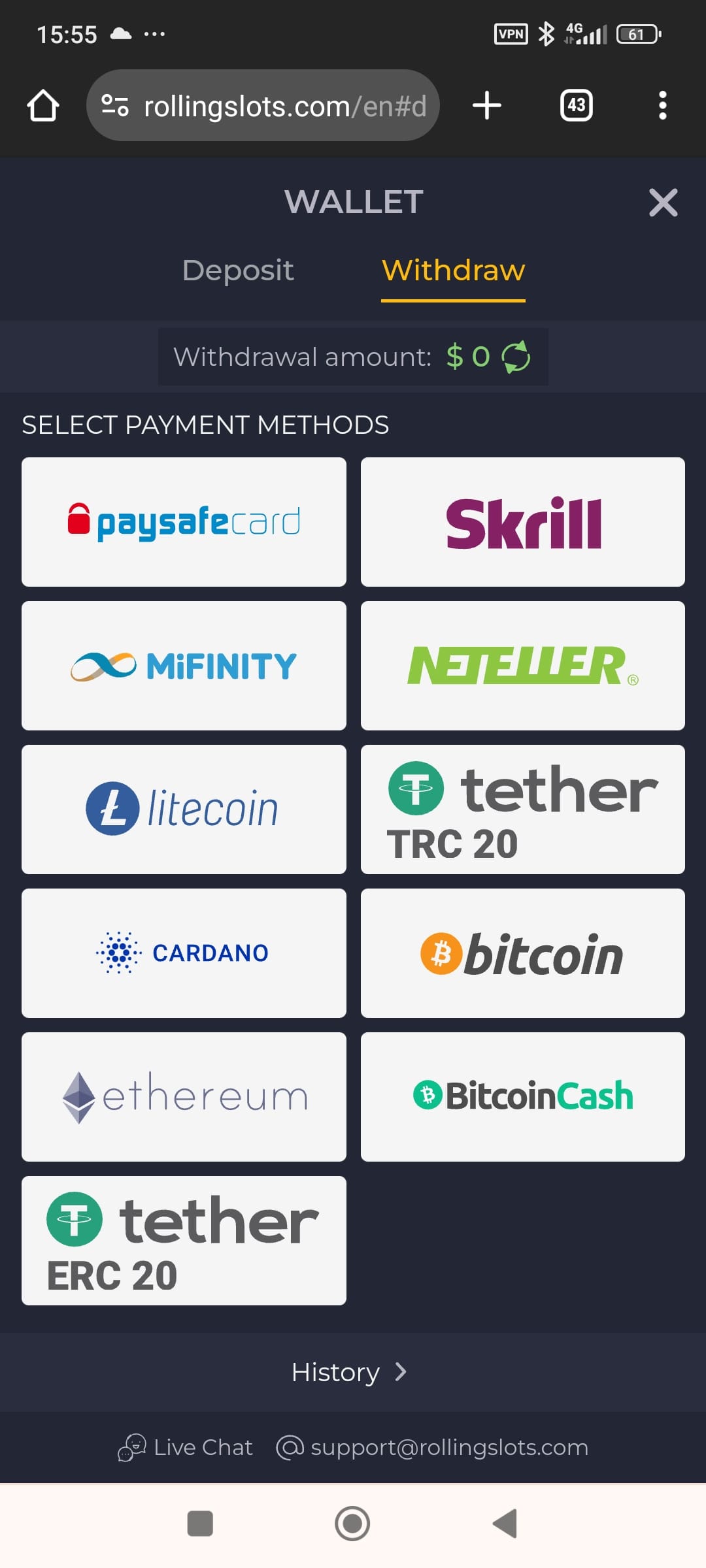 | Deposit options: | Bank transfer, Paysafecard, Visa, Mastercard, Skrill, Neteller, MuchBetter, Mifinity, Crypto, LTC Litecoin, USD Tether, ADA Cardano, BTC Bitcoin, ETH Ethereum, BCH Bitcoin Cash, Interac |