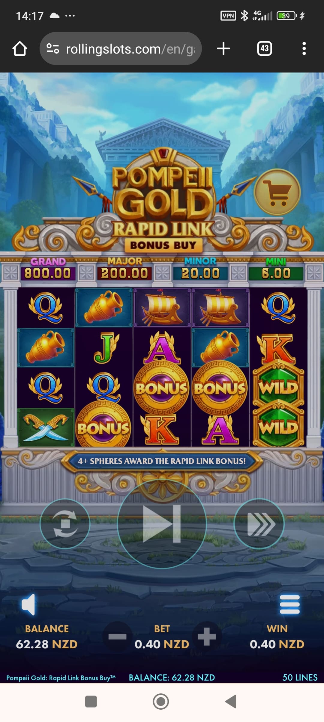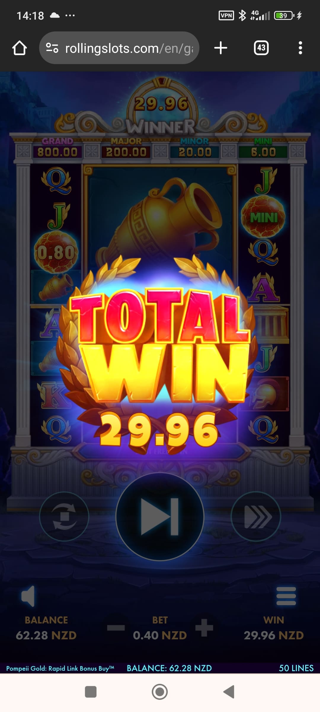 I then went for Pompeii Gold Rapid Link Bonus Buy, and was determined to play it until I triggered the bonus feature. The first 100 spins didn’t work so I doubled my bet and went for 100 more. That worked immediately, I got 5 free spins with giant symbols and won 75x my bet. Sweet!