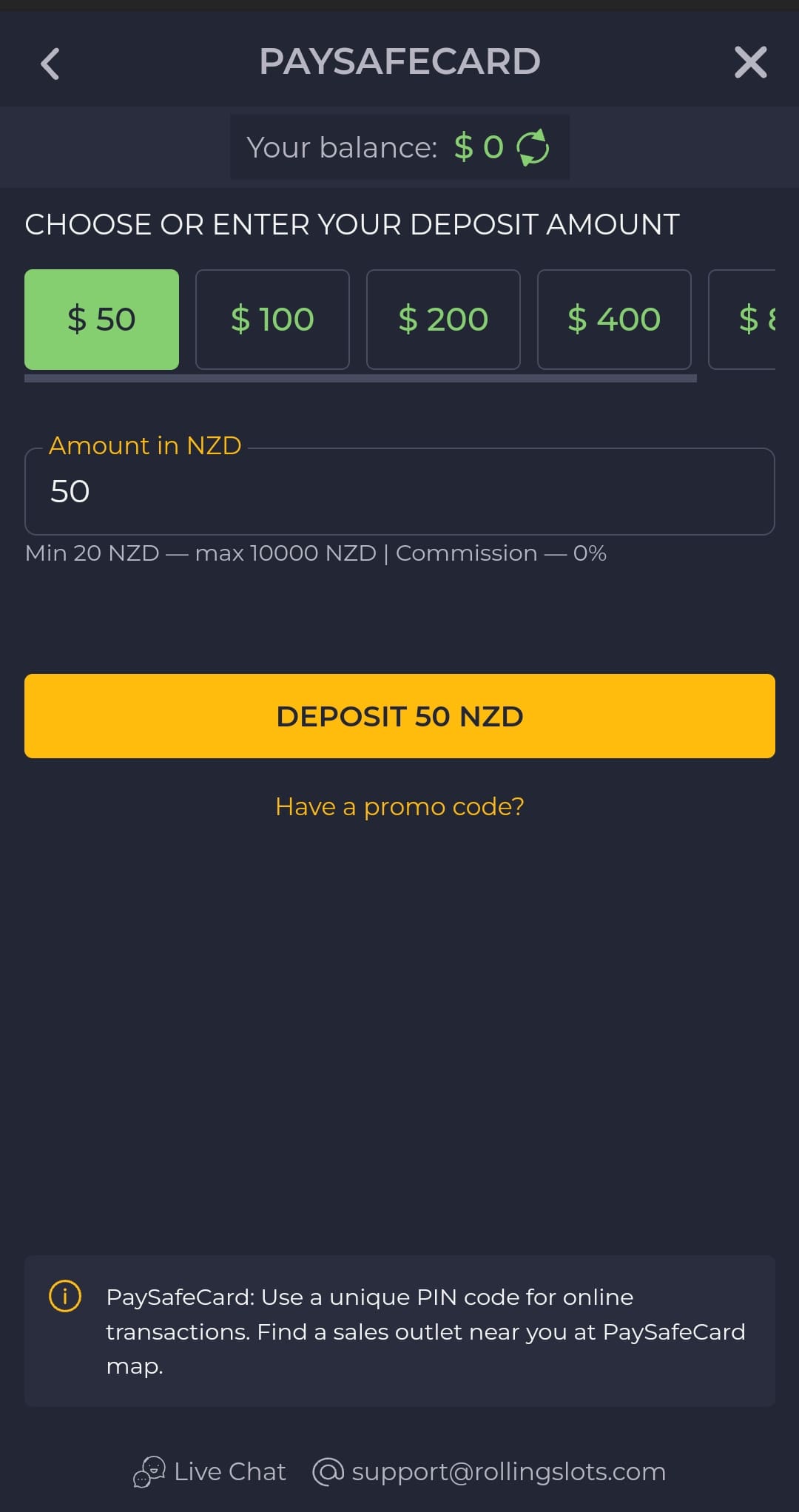 I used Paysafecard to deposit money this time around, and wanted to deposit NZ$50. Eventually I had to settle for deducting 25.04 EUR from my voucher, though that left a few cents on the table.