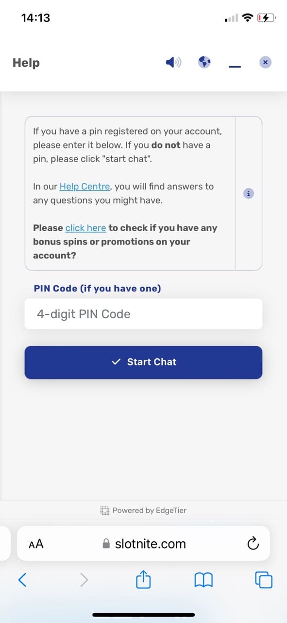 Once you hit the navigation tab in the top left-hand corner of the homepage, you will see the support tab. You hit that, and you gain access to the support page. Don’t forget to provide your details again so that customer support assigns you a 4-digit PIN you can use every time to get help live. If you prefer writing an email with your queries, you can reach Slotnite via their email address, and it could take a day to get a reply. The typical response time through live chat is 30-60 seconds. For some players like me, waiting for long when you have a real issue can be a mare of a job.