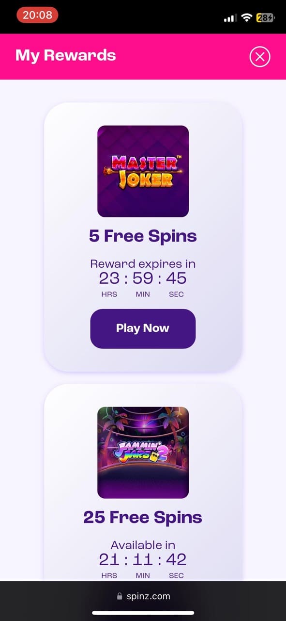 Spinz casino requires a minimum of 10 NZD to claim a welcome bonus. Once I filled out the sign up form and confirmed my email, I funded my account with 25 NZD using Paysafecard. Actually, Spinz has quite a long list of payment methods, which is a big pro. The money arrived instantly, and I ticked the box that I wanted to receive a welcome bonus. The welcome offer is lovely – 100% on the first deposit + 200 free spins which are spread over the next 8 days (basically 25 fs each day) 25 for 8 days. If you like vouchers, check our Paysafe casinos for more NZ sites that accept it.